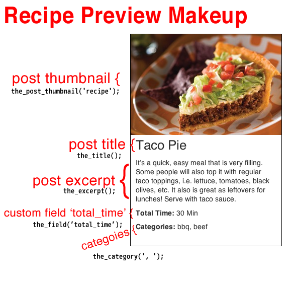 <?php the_post_thumbnail("recipe"); ?> - Gives us the post thumbnail sized for recipe